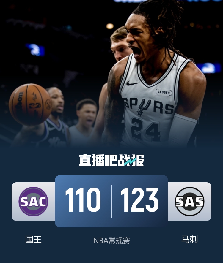 马刺(9-4):福克斯28分2板11助、巴恩斯20分2板3助2断、瓦塞尔16分3板7助2断、凯尔登14分12板1助、科内特13分11板1助3帽、尚帕尼12分2板、索汉11分5板2助、奥利尼克5分6板8助、卡斯尔4分5助、布莱恩特2板、比永博1板